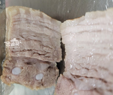 또 뜨거운 고기가 찬물과 만나면서 단단하게 수축해 썰 때 부서지지 않고 모양이 예쁘게 유지돼요.