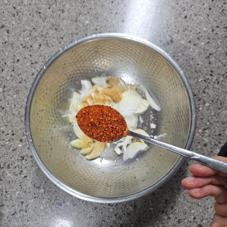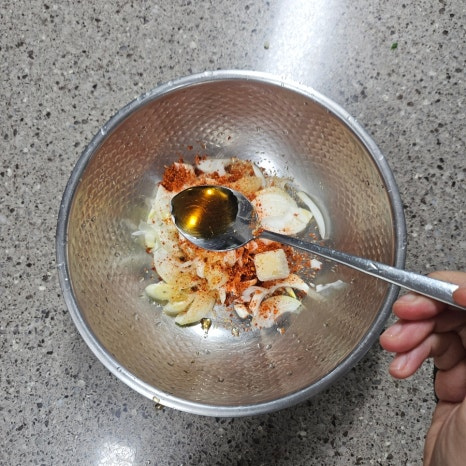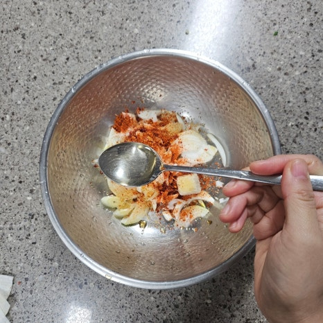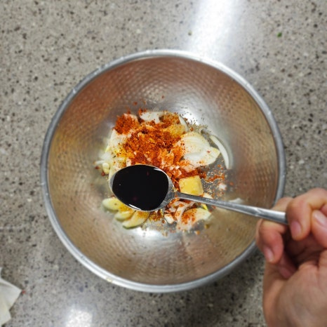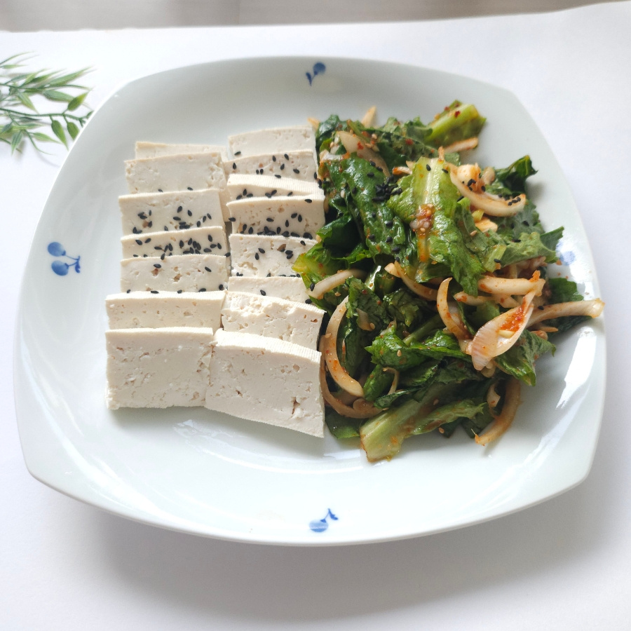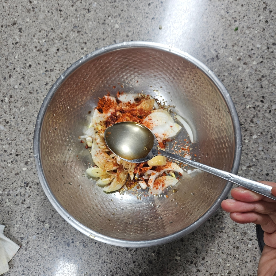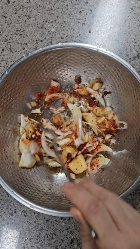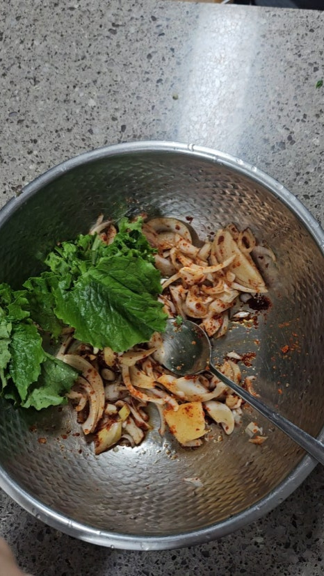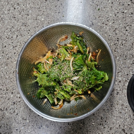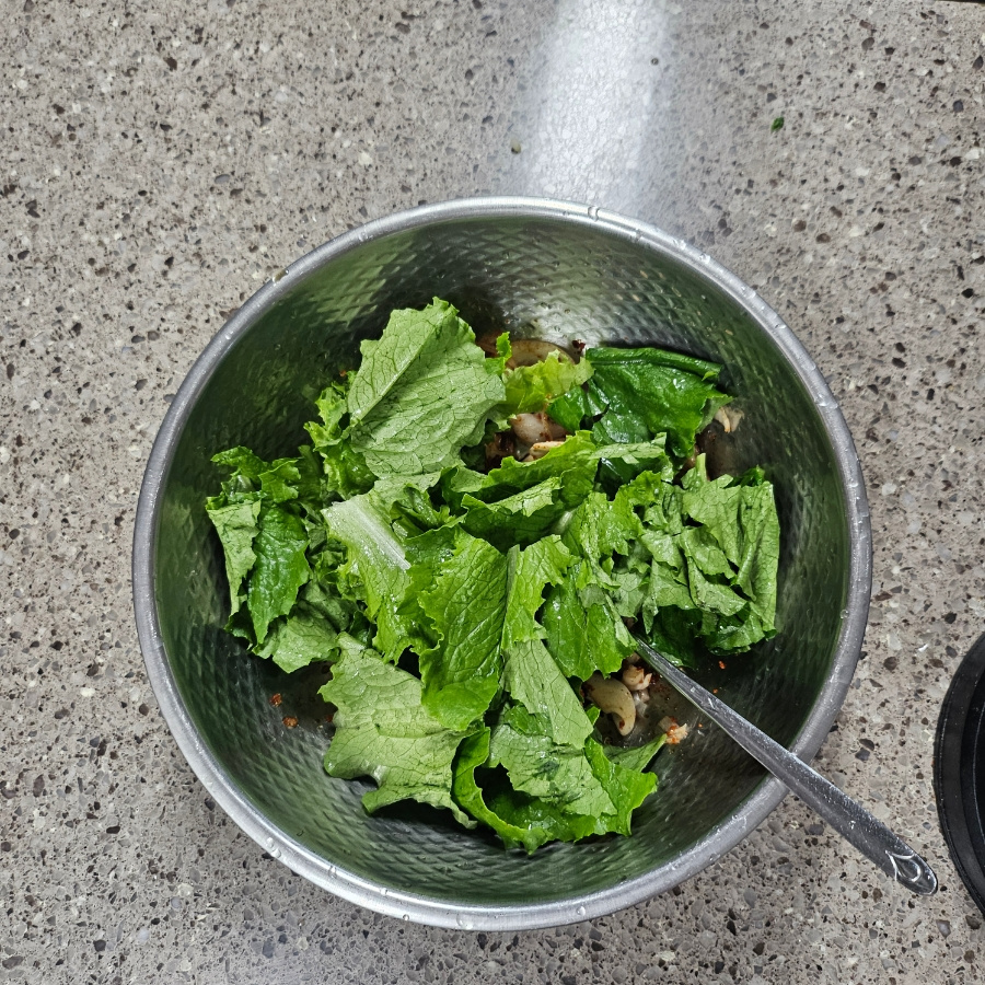 세게 비비면 숨이 죽어 싱싱함이 줄어드니 손끝으로 뒤집듯 섞는 것이 포인트입니다.