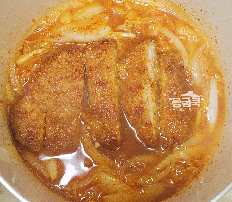 끓고 있는 국물 위에 잘라둔 돈까스 조각을 가지런히 올려주세요.