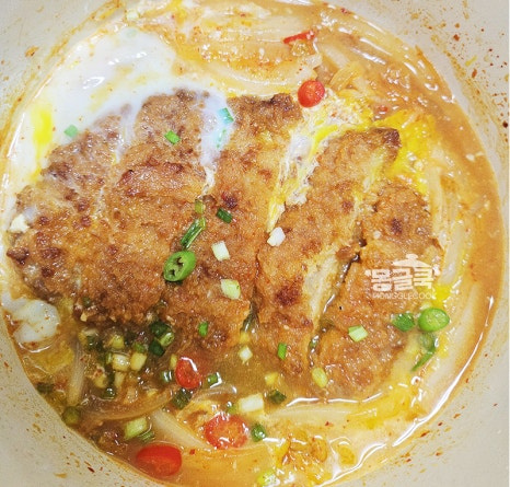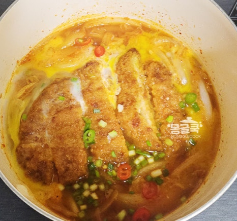 돈까스를 완전히 잠기게 하지 말고, 반쯤 국물에 젖도록 올려주세요.
