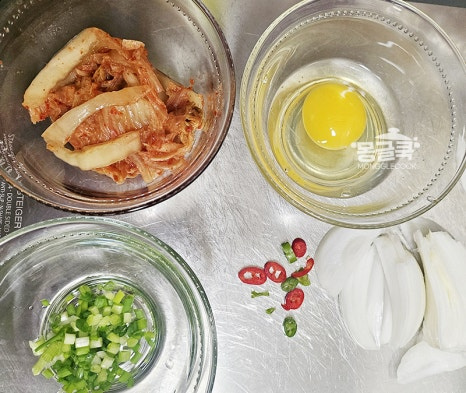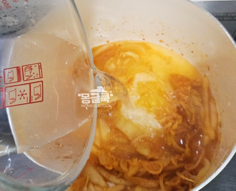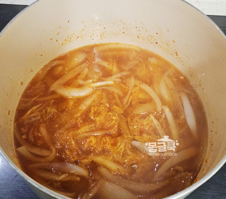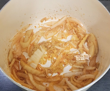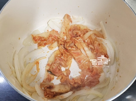 양파가 투명해지면 썰어둔 김치를 넣고 2~3분간 함께 볶아 김치의 깊은 맛을 내주세요.