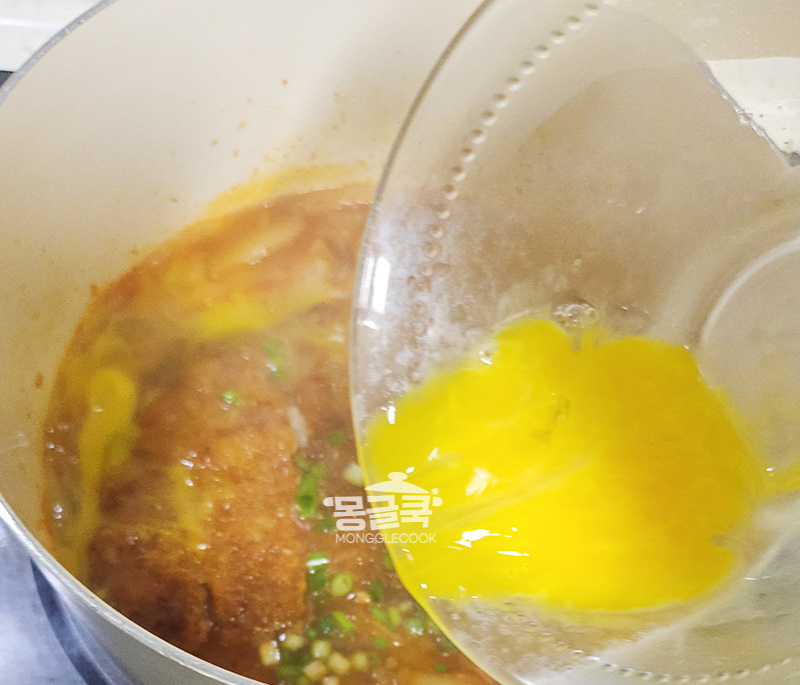 준비한 달걀물을 돈까스 주변을 따라 천천히 부어주세요