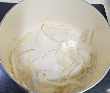 작은 냄비나 뚝배기에 식용유를 약간 두르고 다진 마늘과 양파 채를 중불에서 볶아주세요.