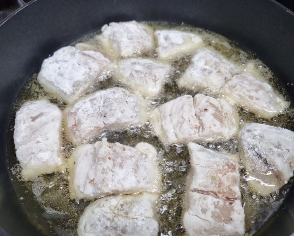 팬에 기름은 넉넉히 두르고 반죽넣었을 때 반죽이 바로 떠오른 정도가 삼치 넣지 적당한 온도입니다. 옆에 기름빠지는 망도 미리 준비해두세요~