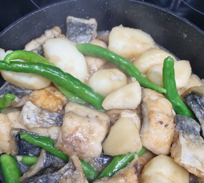 감자가 반쯤 익으면 구운 삼치를 넣고, 국물을 계속 끼얹어주며 졸여요. 양념이 잘 배도록 중약불 유지! 마지막에 꽈리고추 넣으면 색도 예쁘고 매콤한 향이 살짝 올라와요.