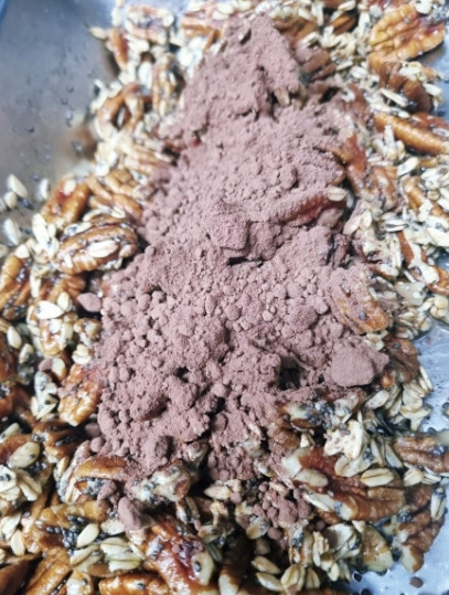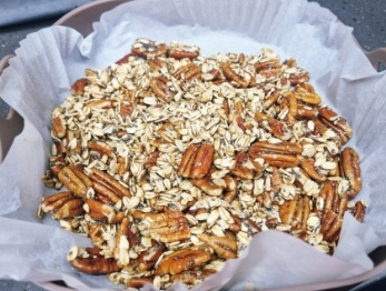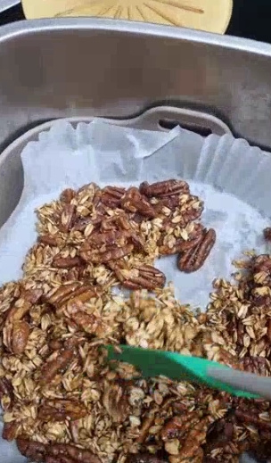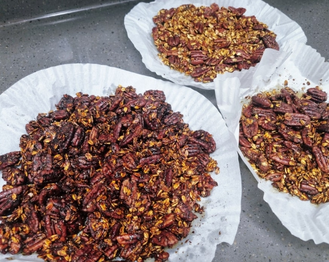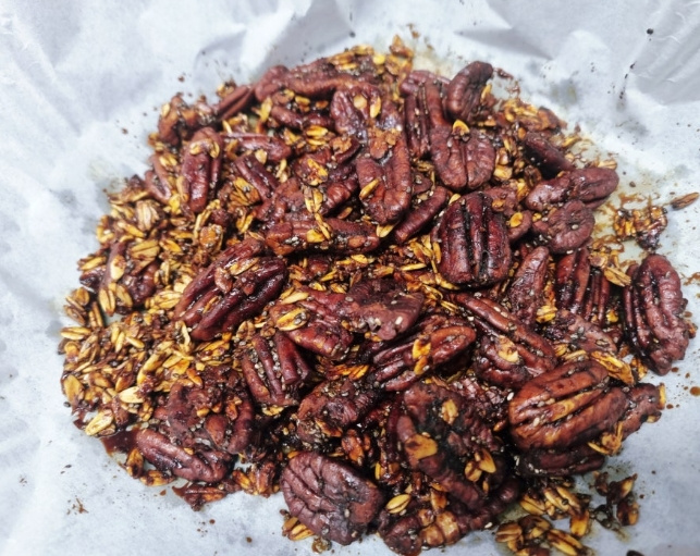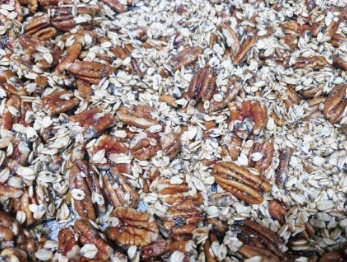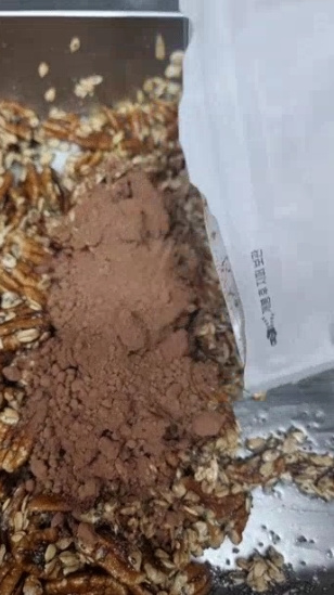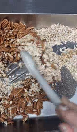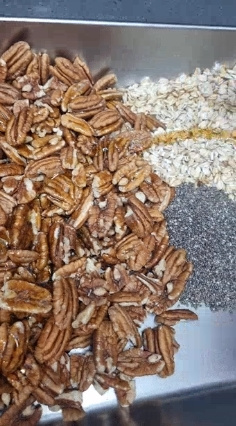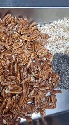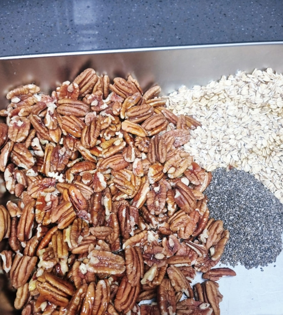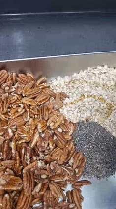사용한 감미료는 알룰로스와 메이플 알룰로스로, 설탕 대비 혈당 영향을 낮출 수 있는 저당 조합을 선택했어요. 또한 오트밀은 분쇄형 오트밀(Quick Oat)보다 롤드오트밀(Rolled Oat) 이 소화 속도가 느려서 혈당 관리에 더 유리하다해서 롤드오트밀을 사용했습니다. 그리고 견과류는 그냥 알갱이보다는 식감이 살아있는 큰 피칸을 선택! 대장활동과 포만감을 위해 식이섬유가 풍부한 치아씨드도 함께 넣어 고소함을 더해 간편하게 저당그래놀라를 만들어봤습니다!