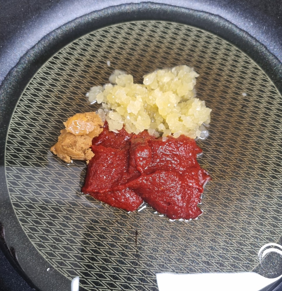 후라이팬에 현미유, 고추장, 고춧가루, 간장, 올리고당, 다진 마늘, 땅콩버터를 넣어줍니다. 설탕은 냉장고에 넣으면 딱딱해지기 때문에 추천하지 않습니다.
