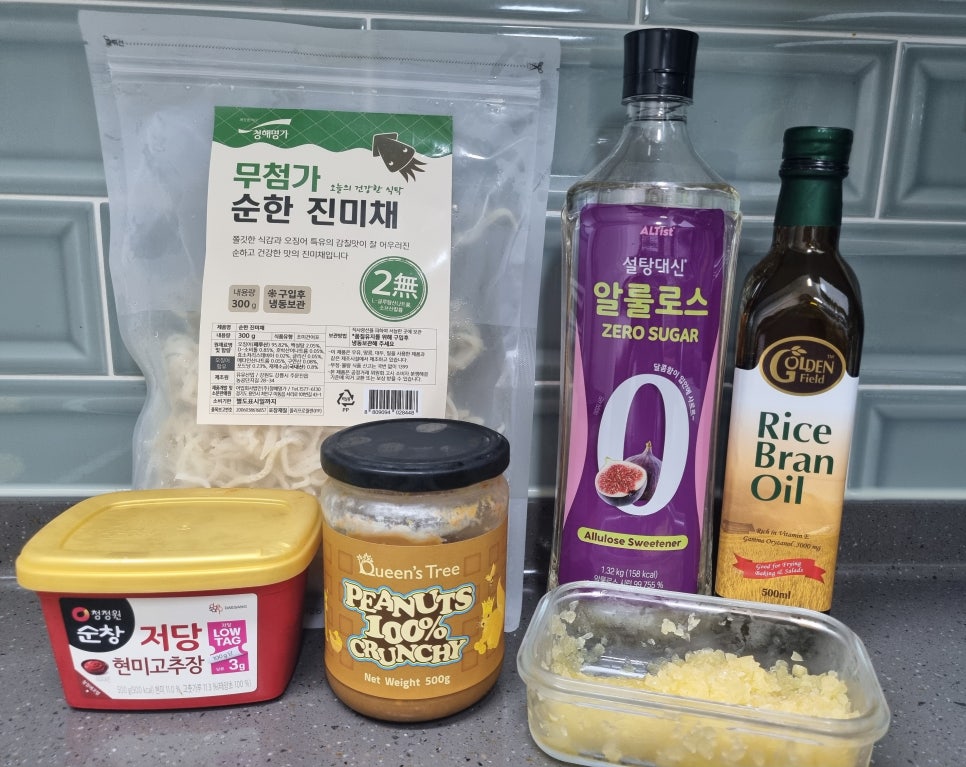 진미채(오징어채) 300g현미유 200ml고추장 5큰술고춧가루 1큰술간장 1큰술올리고당 5큰술다진 마늘 1큰술참기름 1큰술깨소금 약간땅콩버터 1작은술