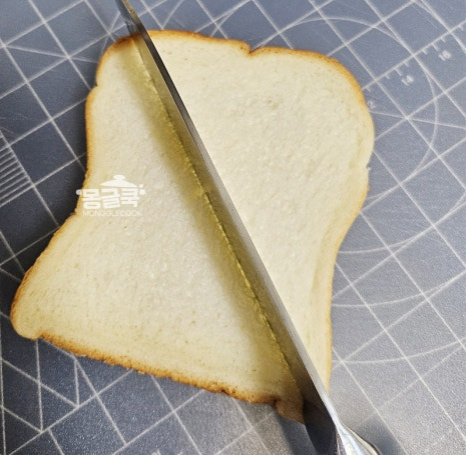 식빵의 대각선 모서리를 향해 칼로 사선으로 비스듬하게 잘라주세요.