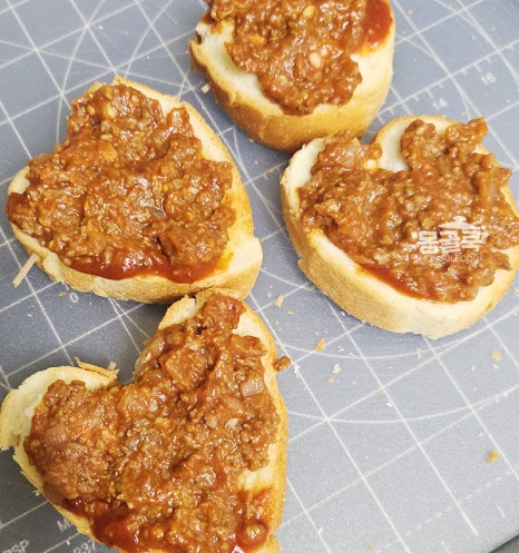 하트 모양 식빵 위에 피자소스 또는 스파게티 소스를 취향에 맞게 듬뿍 발라주세요.