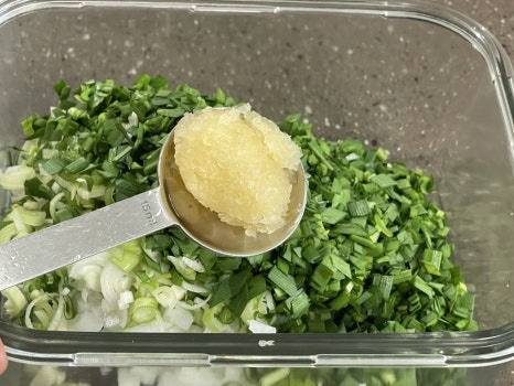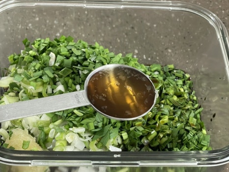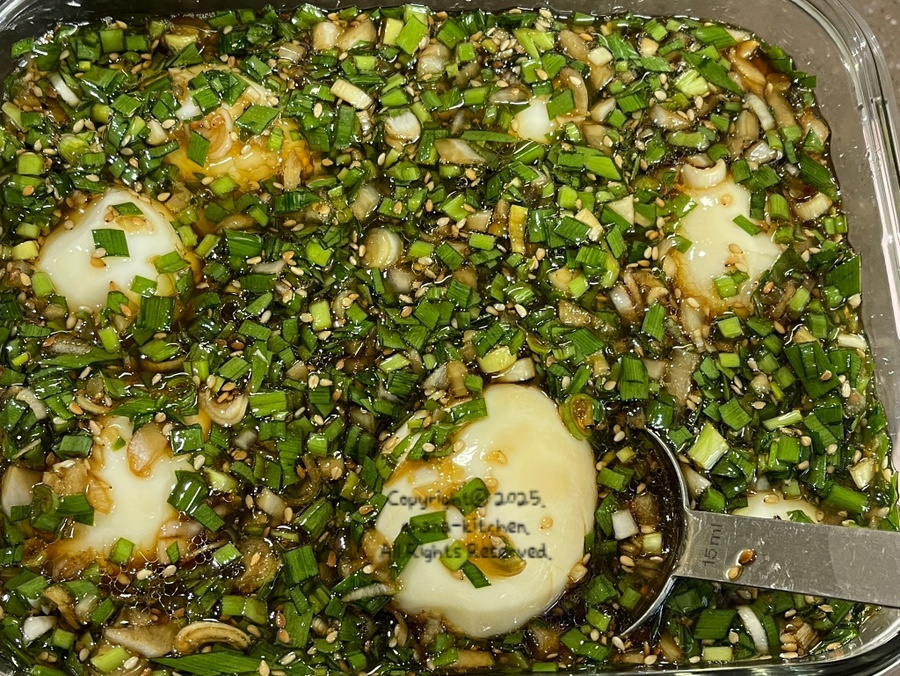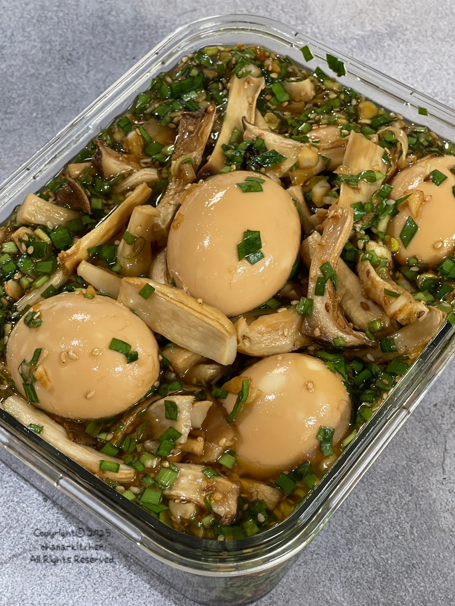 양파, 대파, 부추는 잘게 썰어 주고 간마늘1/2T, 진간장150ml, 참치액3T, 물1컵, 알룰로스1/2컵, 미림2T, 참기름2T, 통깨1T을 섞어 준 뒤 새송이버섯, 삶은 계란을 넣어 마무리해주세요.
