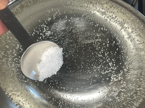 끓는 물 1.5L에 소금1tsp, 식초 1T를 넣고 계란을 담가 주세요.