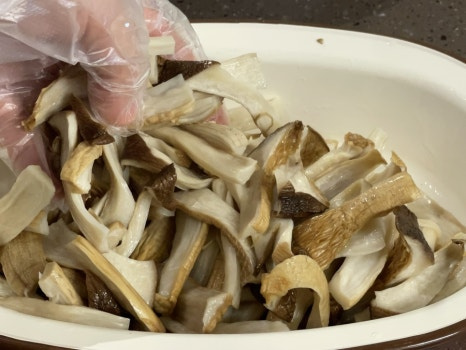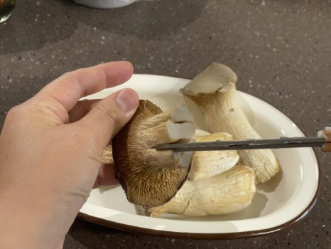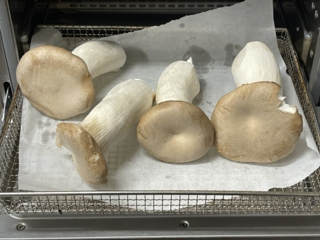 새송이버섯은 에어프라이어기 160도에서 20분 동안 구워 가위로 칼집만 내주고 손으로 먹기 좋은 크기로 찢어 주세요.