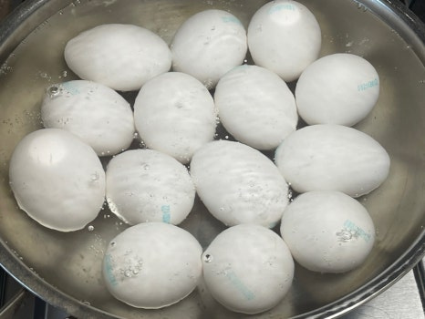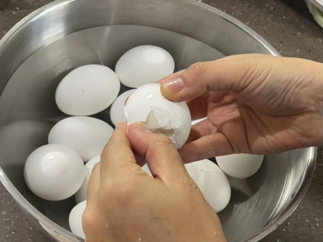 삶은 계란은 바로 헹궈 찬물에 담가 식혀 준 뒤 계란 껍데기를 벗겨주세요.