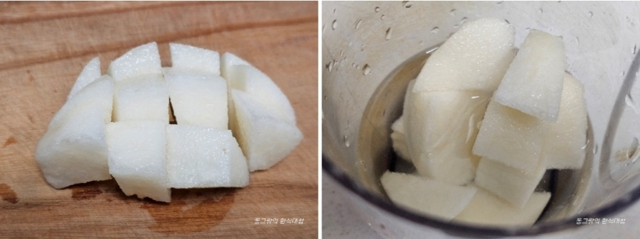 류수영 님은 갈아만든 배주스(238ml) 1 캔을 넣었는데 저는 배 음료 대신 제철 배에 물을 부어 갈았답니다.