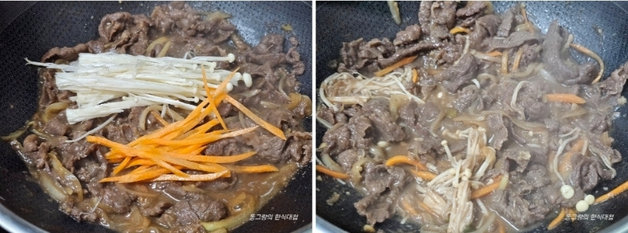 소고기 750 g (불고기용), 양파 반 개 , 대파 1 대 (양념), 당근 , 팽이버섯 , 대파(채 썬 것 데코용) 반 대 , 식용유 1 큰술 , 참기름 반 큰술 (완성 후), 통깨 조금