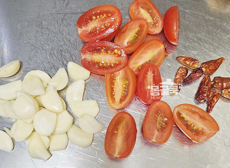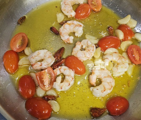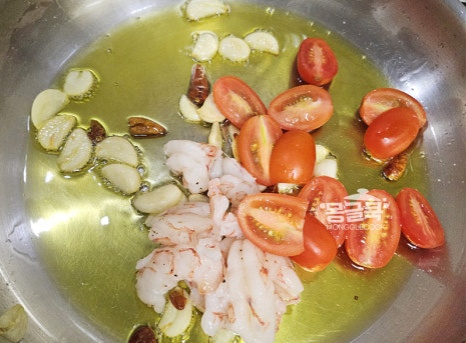 마늘이 노릇해지면 밑간한 새우와 방울토마토를 먼저 넣어 주세요.