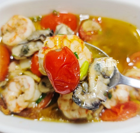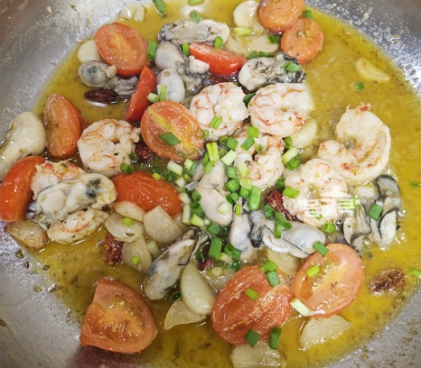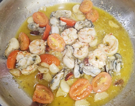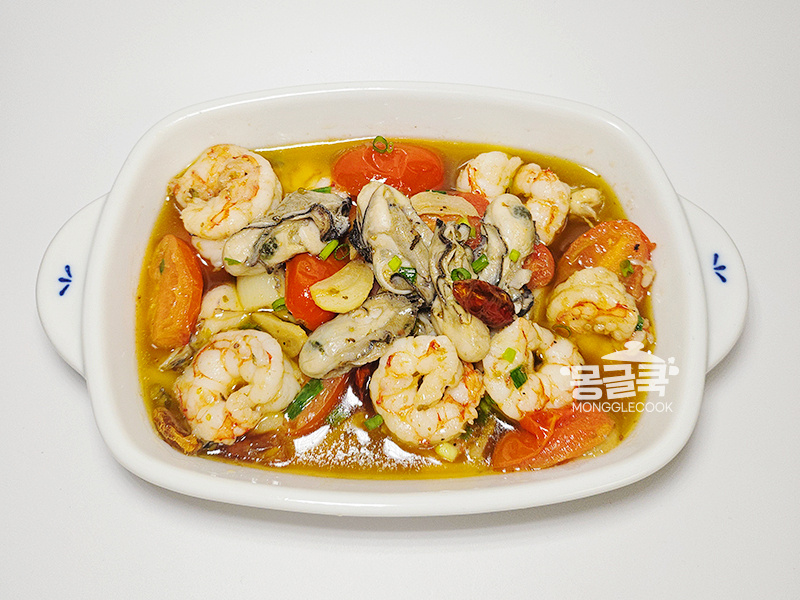 새우가 반 정도 익으면 (약 1~2분 후), 밑간한 굴을 넣어주세요.
