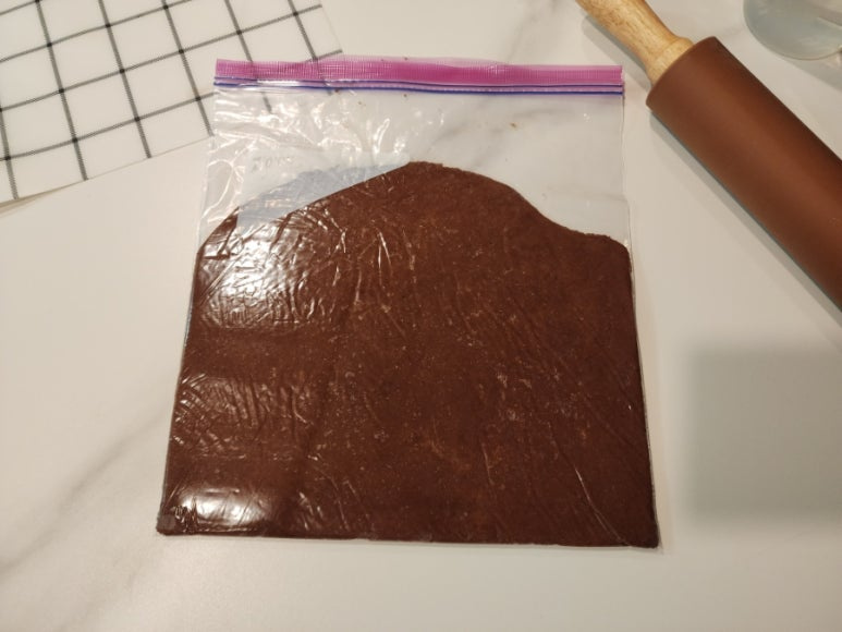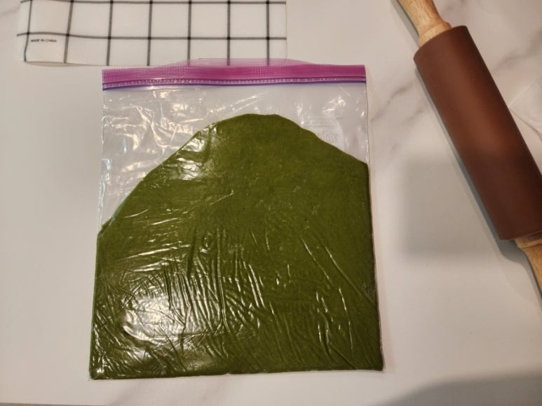 밀대로 평평하게 밀어서 원하는 두께 1센티 (10m) 로 만들어서 냉장고로 반죽 직행!!! 반죽 만든후 최소 1시간 냉장고에서 휴지해줄것!!!