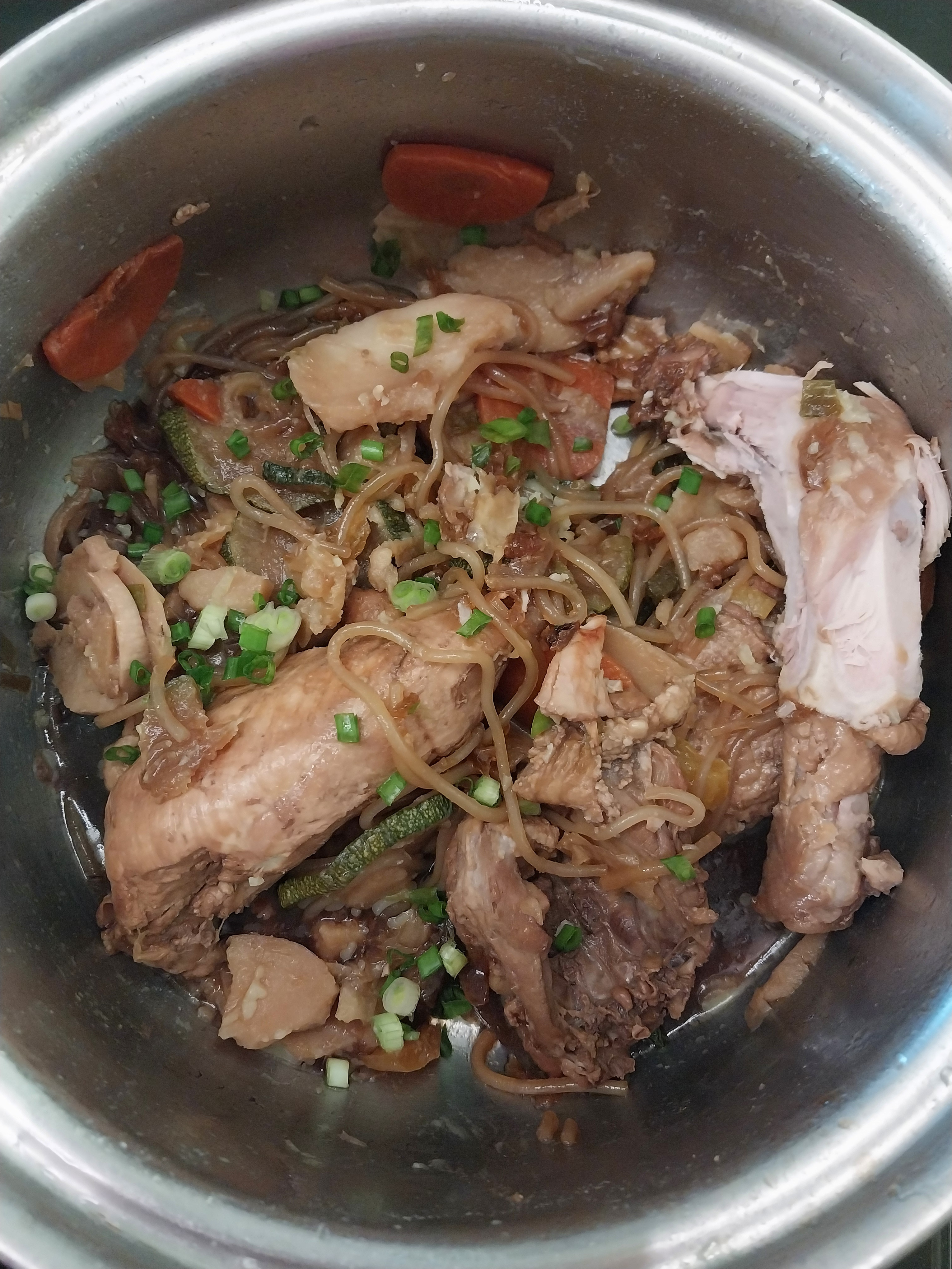 깨끗한 남비에 닭을 넣고 만능소스를 넣고 물을 추가해서 끓여줍니다 감자와 당근을 넣고 다른 야채들은 익는 순서를 고려해서 나중에 넣습니다 미리 물에 불려둔 당면을 넣고 골고루 저어줍니다
