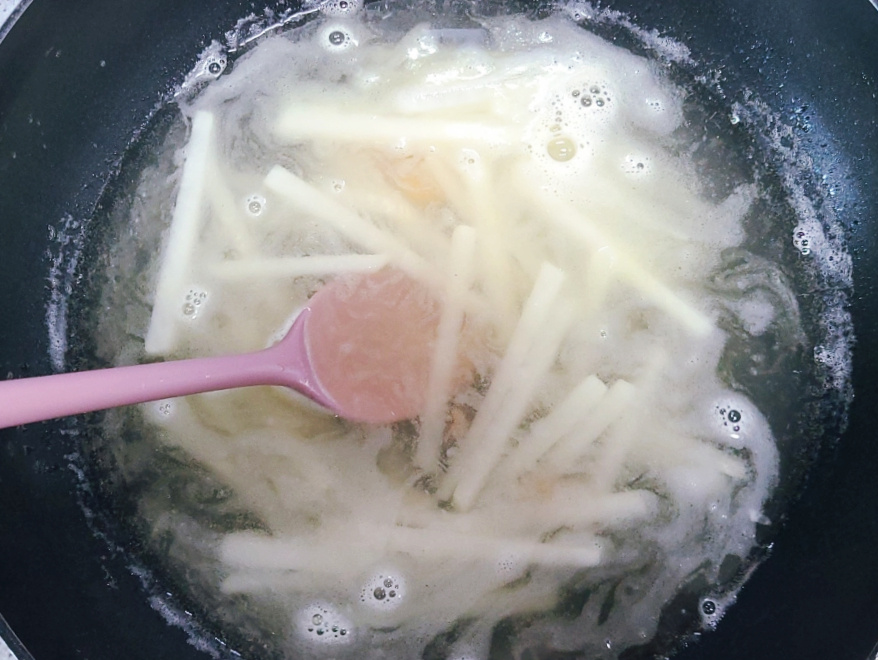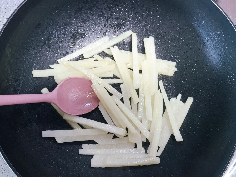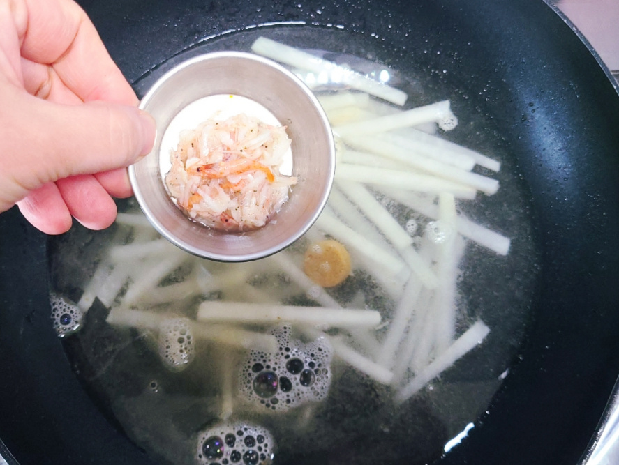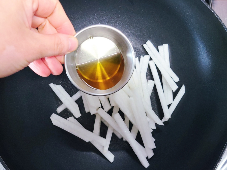 냄비에 무채와 들기름 1큰술을 넣고 가스불 중불에서 무채를 2분 정도 볶아줍니다.
