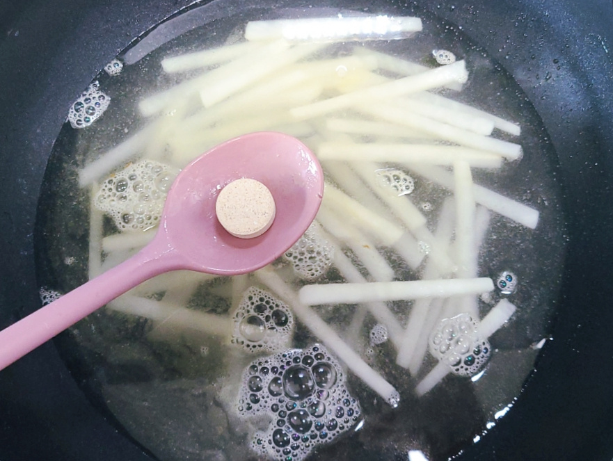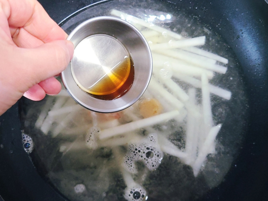 5분간 끓인 고기없는 무국 맛을 보고 싱겁게 느껴지면 소금을 살짝 추가하여 간을 맞춰주고, 국물이 많이 줄었을 경우에는 물을 추가하고 한소끔 끓인 후에 다시 간을 맞춰주면 되세요.