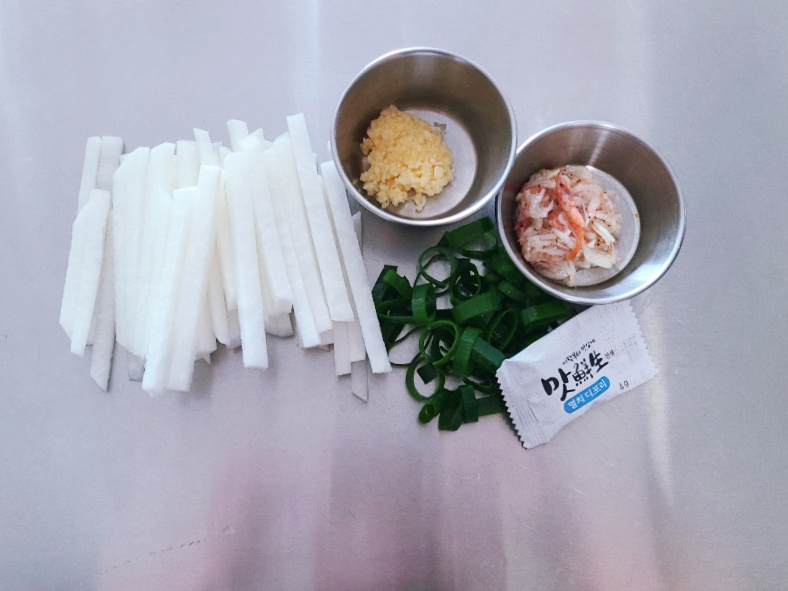 무채 150 g , 대파 15 g , 들기름 1 큰술 (밥 숟가락계량), 새우젓 1 큰술 (밥 숟가락계량), 참치액 0.4 큰술 (밥 숟가락계량), 다진마늘 0.7 큰술 (밥 숟가락계량), 동전육수 1 개 (밥 숟가락계량), 물 600 ml