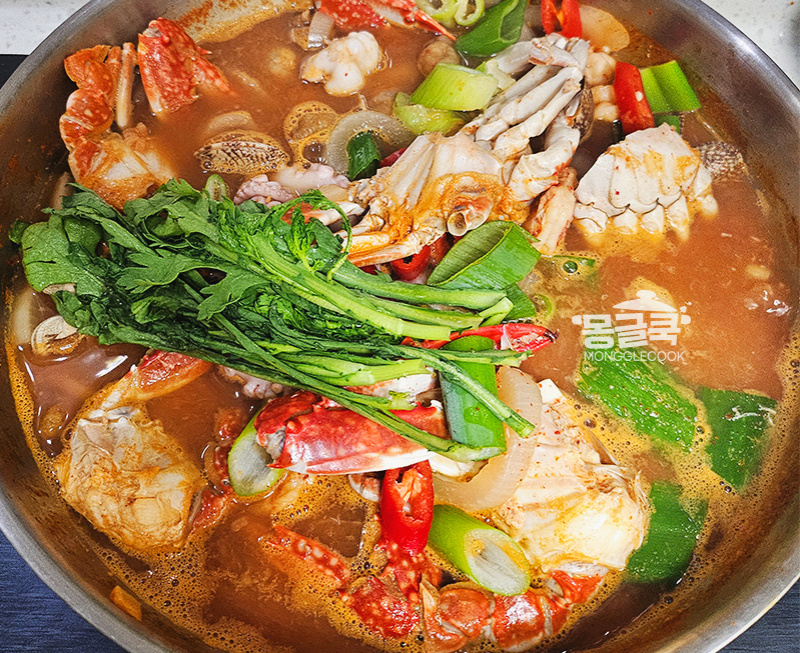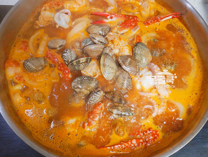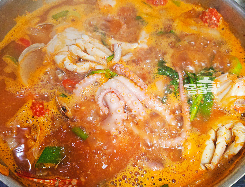 꽃게, 새우, 오만둥이 같은 단단한 해물을 먼저 넣고 끓여주세요.