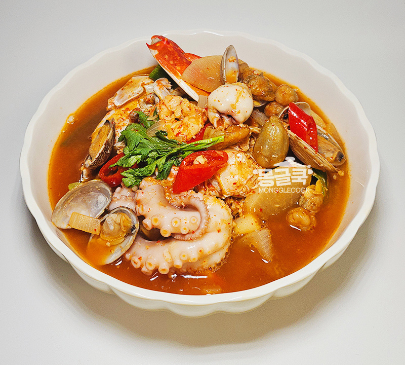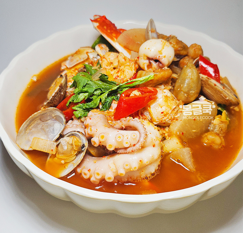 냉동 꽃게 500 g , 새우 5~6 마리 , 바지락 300 g , 낙지 1~2 마리 , 미더덕/오만둥이 50~80 g , 무 100 g , 다시마 1~2 조각 , 양파 1/2 개 , 대파 1/2 대 , 청양고추 1~2 개 , 홍고추 1/2 개 , 쑥갓 또는 미나리 약간 ,