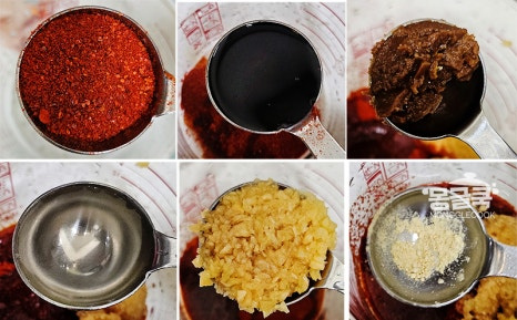 고춧가루 3~4 큰술, 국간장(조선간장) 2 큰술, 다진 마늘 1.5 큰술