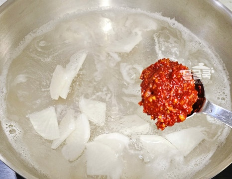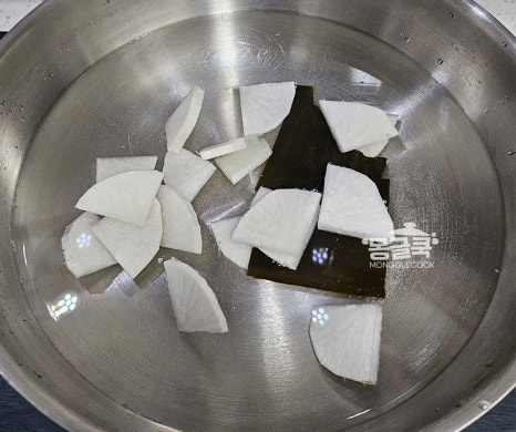 냄비에 물1.2L ~ 1.4L를 붓고 나박하게 썬 무를 넣고 끓여 주세요.