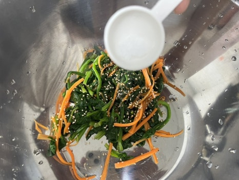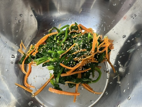부드러운 식감을 원하시는 분들은 시금치 뿌리부분을 잘라서 사용해주세요.