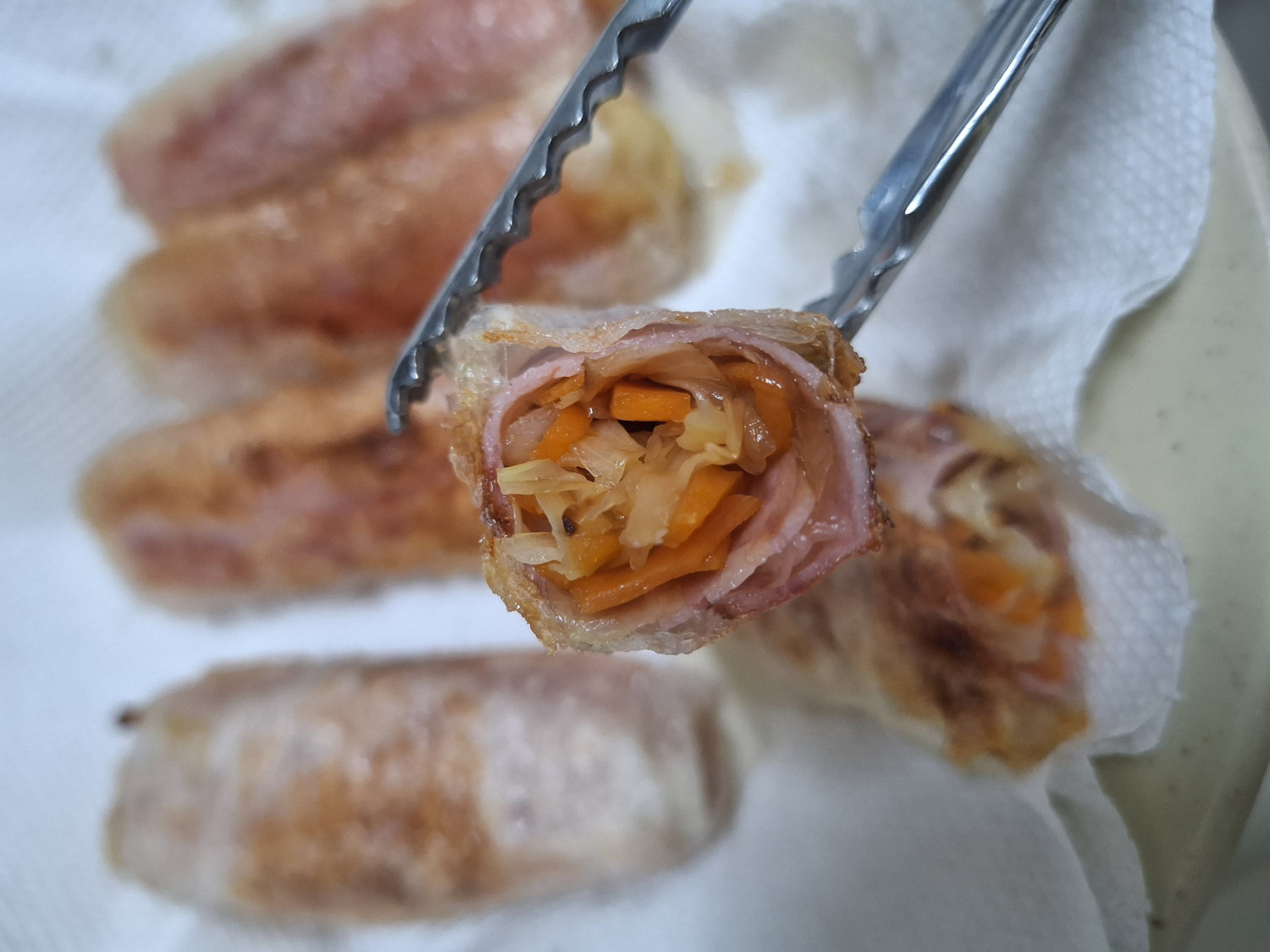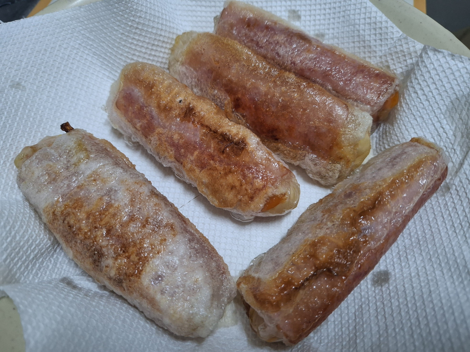 다 튀겨진 햄양배추롤튀김은 키친타올 위에 올려