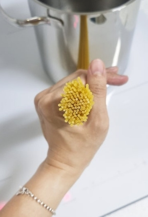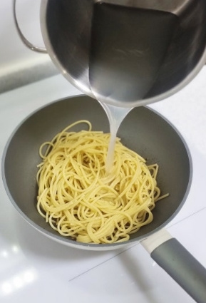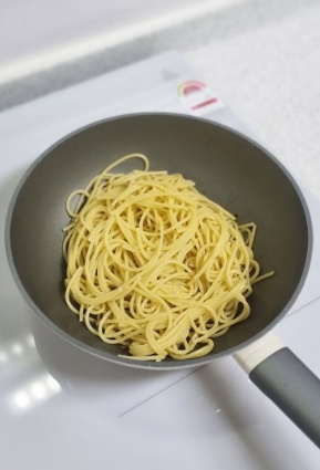 단단한 면이 물에 다 잠기면 그때부터 8분간 삶아줍니다 8분이 딱 알맞기의 익힘이에요 우리가 많이 들어봤던 '알텐테'는 파스타면이 씹히는 느낌이 들게 다 익지않은 상태의 면이예요 한국인은 특성상 단단한 면을 선호하지 않기때문에 우리 입맛에는 8분 삶은 면이 딱 잘 익어 알맞다고 합니다^^ 삶아진 면을 건지고 올리브 오일에 살짝 섞어두세요 (중요! 면이 불어 면끼리 달라붙지 않습니다^^) 삶은 면수는 다 버리지말고 여유롭게 한컵정도 준비해둡니다~
