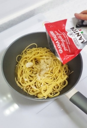 그리고 집에있는 치즈(파마산 치즈가루 또는 그라파다노 치즈) 넣고 한번 섞어준뒤