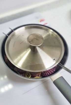 그 위에 세척한 홍가리비 얹어서 뚜껑을 잠시 덮어 가리비를 익혀주세요 가리비는 익는시간이 짧고 오래 익히면 질겨지니까 입이 살짝 벌어져 속이 익으면 됩니다^^ 그리고 섞어서 담아주세요
