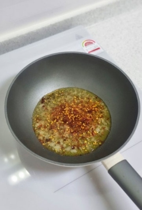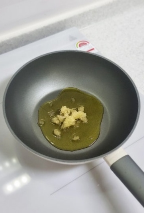 엑스트라버진 올리브 오일을 넉넉히 두른 팬에 다진마늘을 넣고 볶아 마늘향을 충분히 내주세요 마늘이 노릇노릇 해지면 레드페퍼를 취향껏(매운맛 러버) 넣어줍니다 한번 휘리릭 볶아