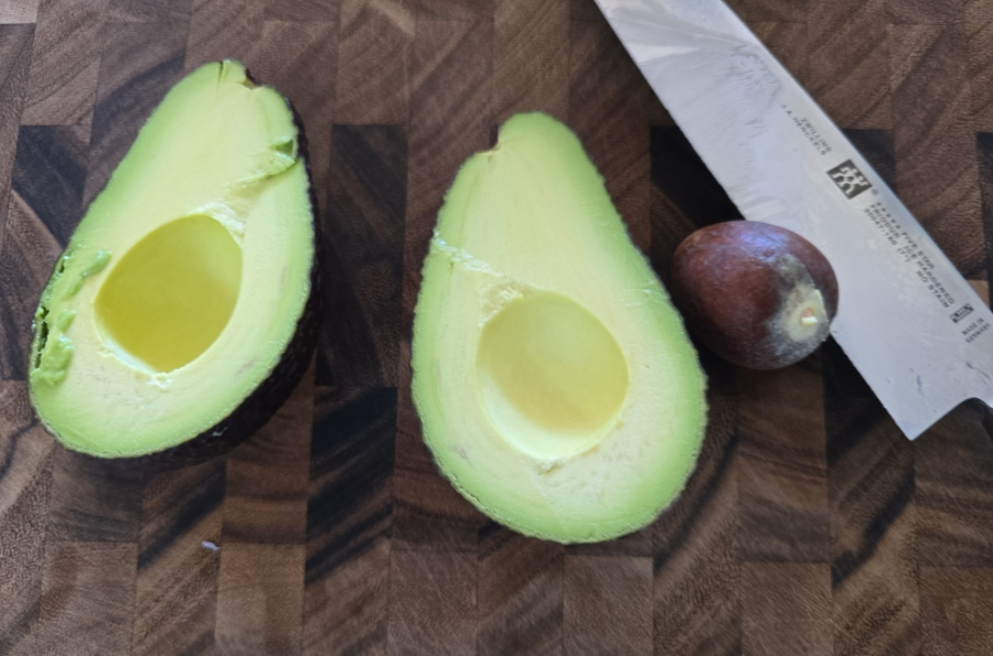 후숙된 아보카도는 칼을 이용해 세로 중심선을 따가 씨가 닿을 때까지 깊숙이 칼집을 넣어주세요.