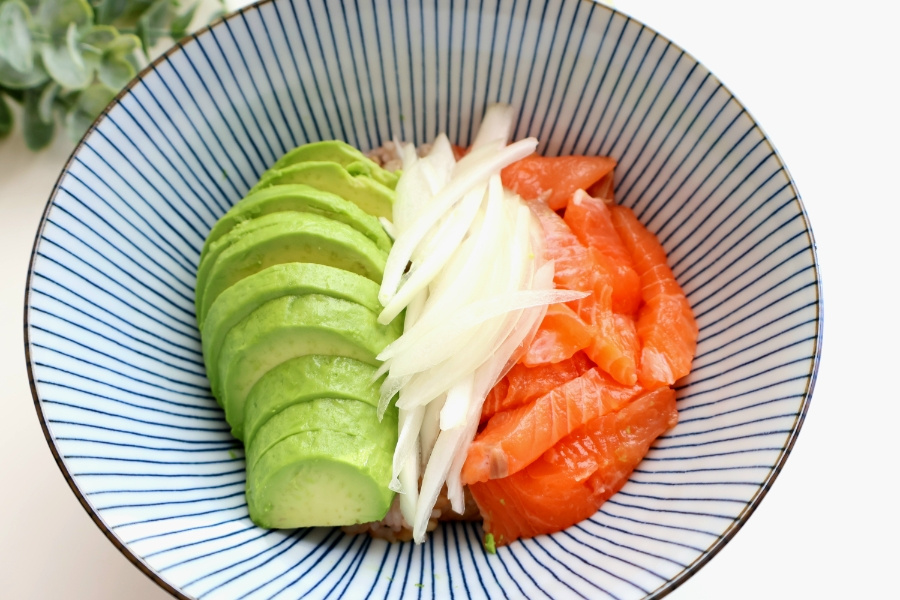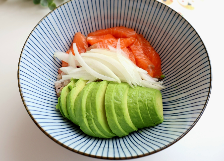 밥 한 공기 생연어 120g 후숙 아보카도 1/2개 양파 1/4개 , 소스 : 진간장 2 레몬즙 1 맛술 1 알룰로스 1 , 계량 : 밥숟가락