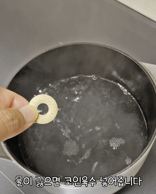 물이 끓어오르면 코인육수를 넣어 감칠맛을 먼저 잡아줍니다.