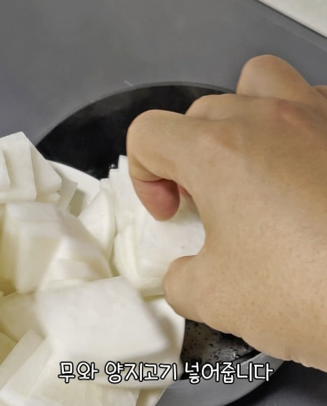 그다음 무 400g과 소고기 100g을 넣고 끓여주세요.