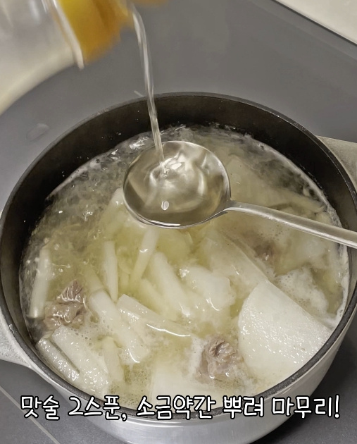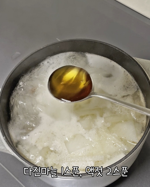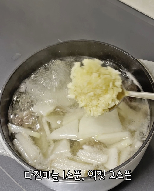 다진마늘 1스푼, 참치액젓 2스푼, 맛술 2스푼, 소금 약간을 넣고 무가 충분히 익을 때까지 보글보글 끓여주면…