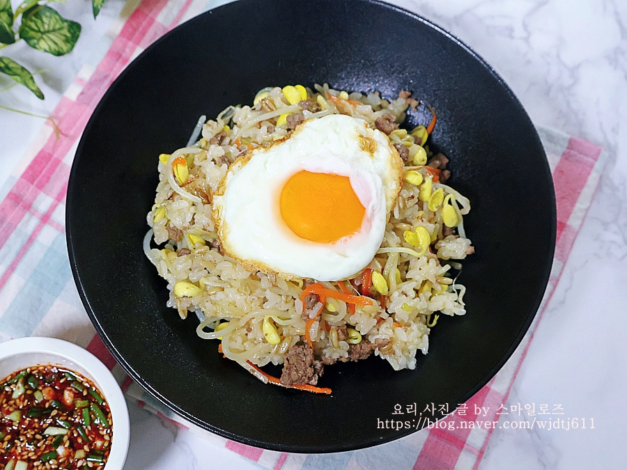 잘 섞은 후 그릇에 담고 계란프라이 1개 반숙으로 만들어서 올려줍니다