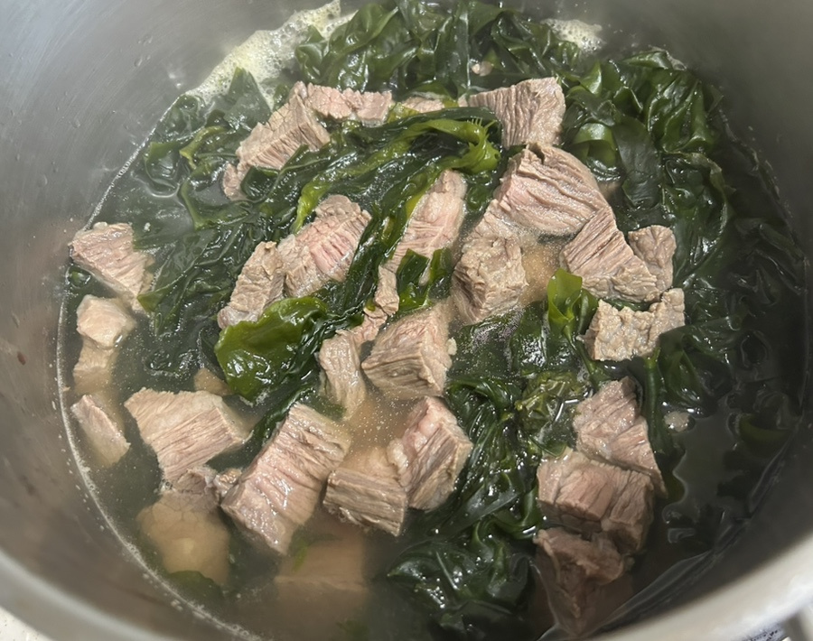 오늘은 염장 미역과 소고기를 넣고 소고기 미역국을 끓였어요.