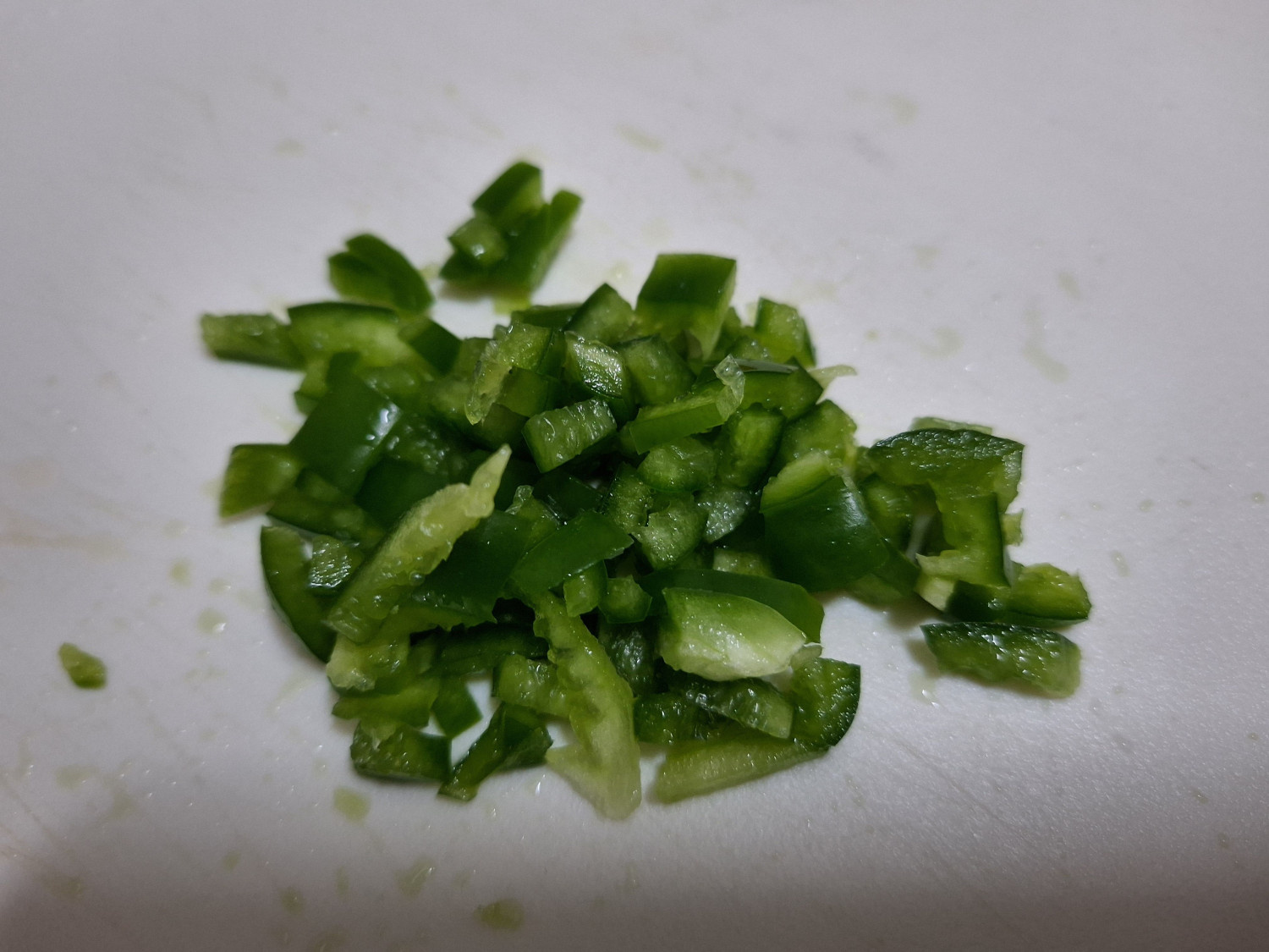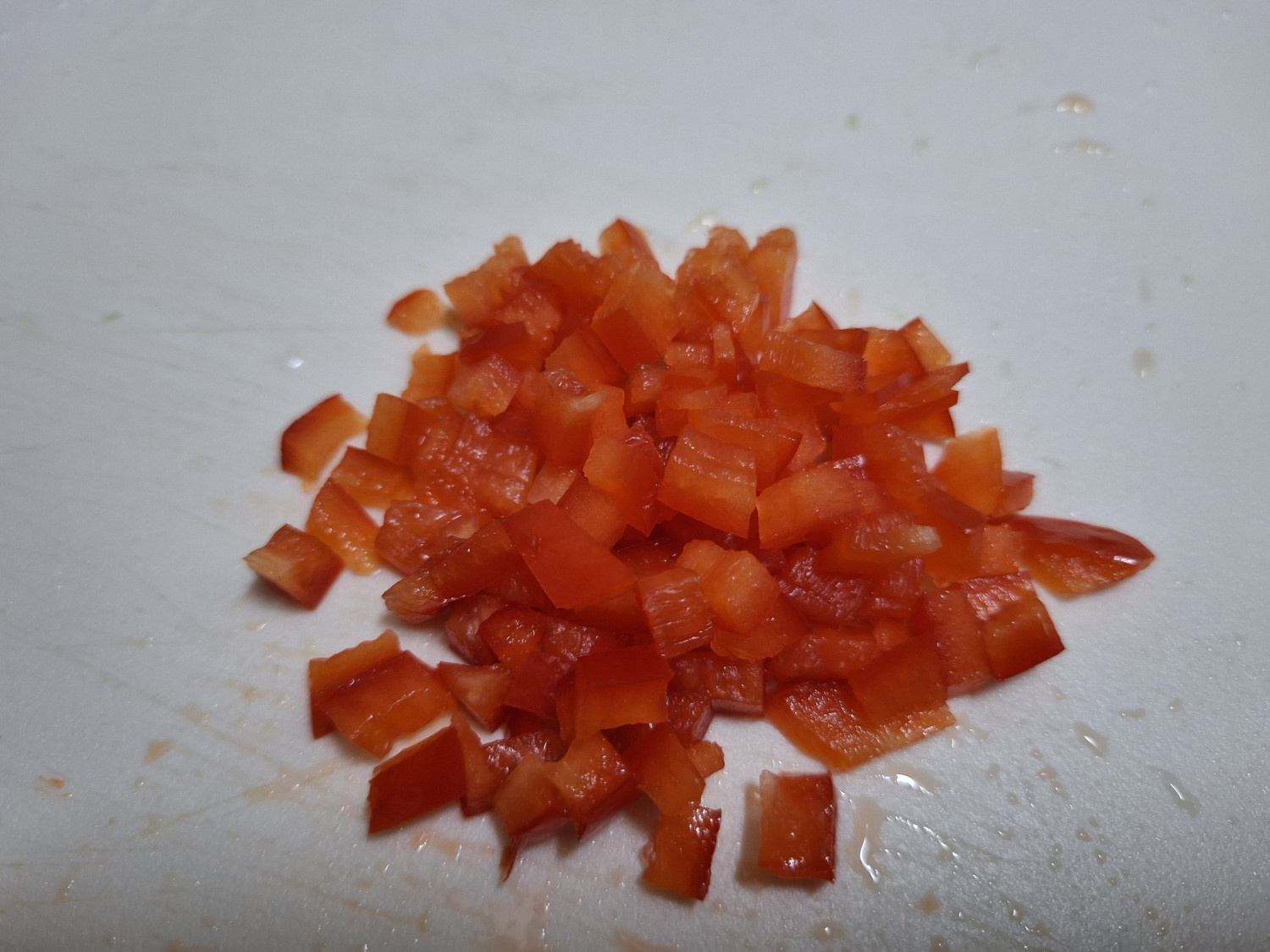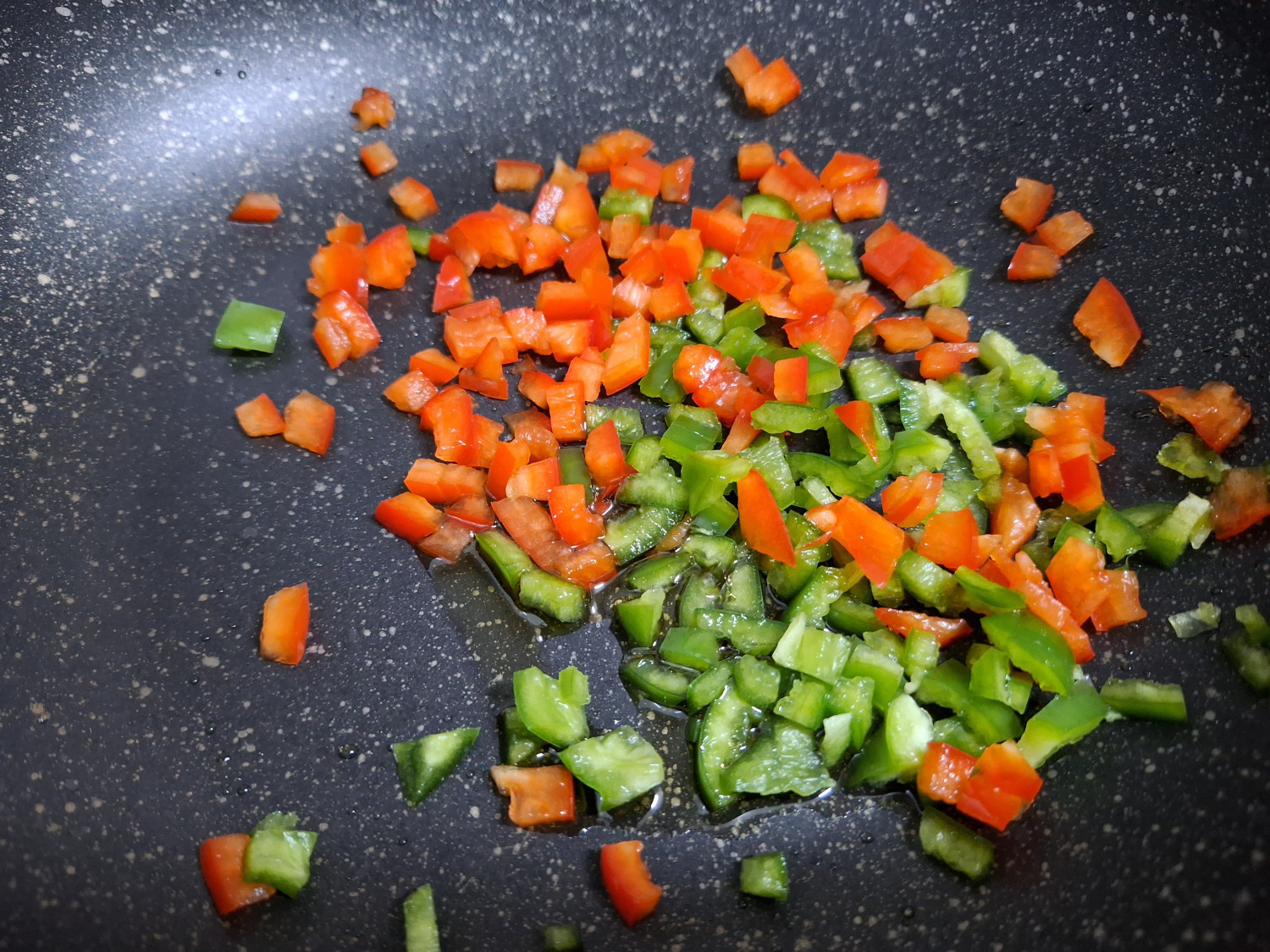 다진 피망과 빨간 파프리카를 넣어주세요.