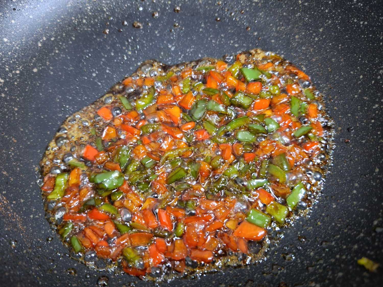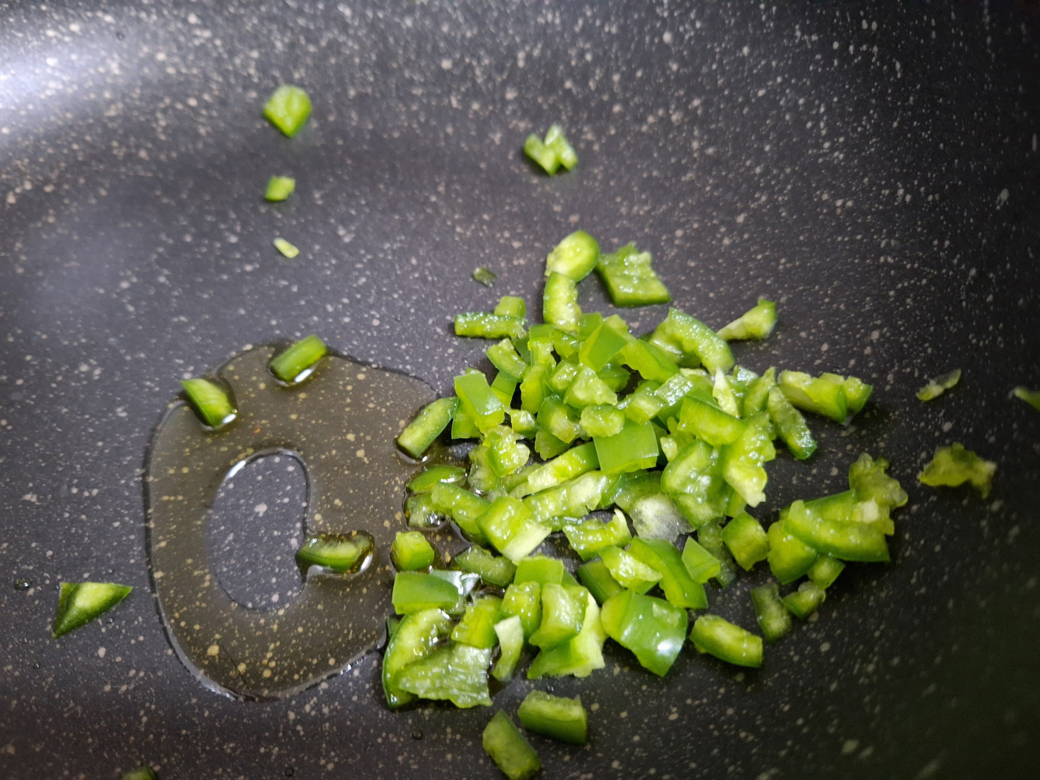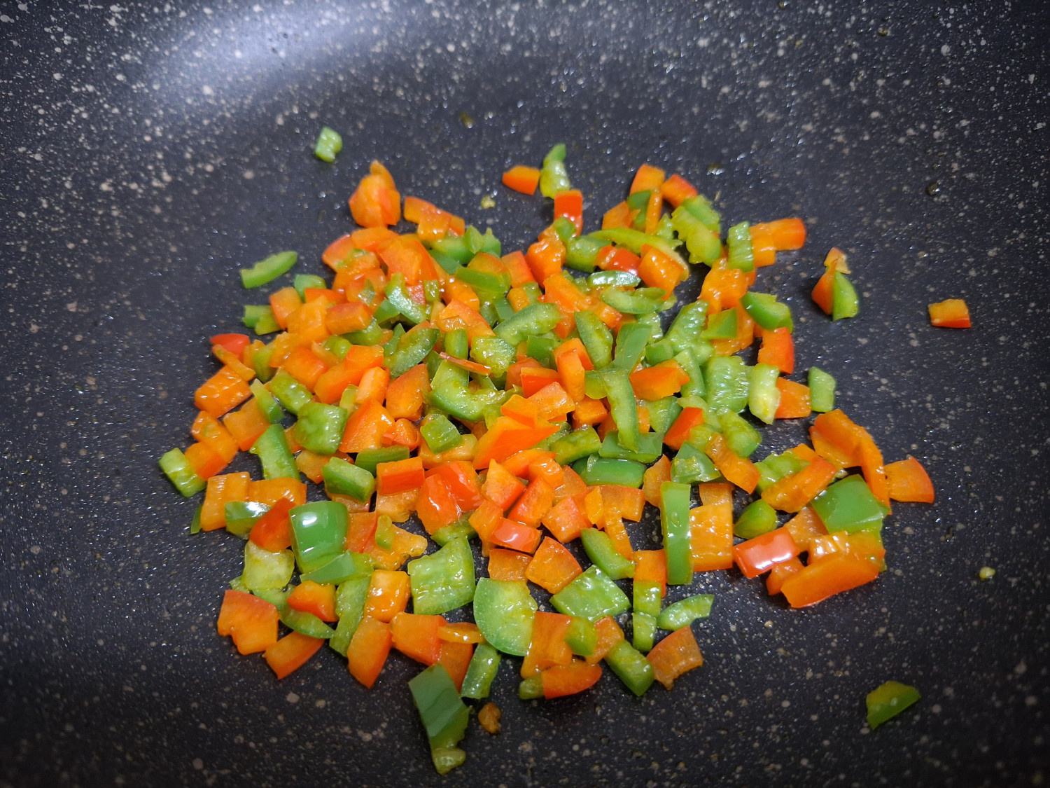 다진 피망과 빨간 파프리카를 넣어주세요.