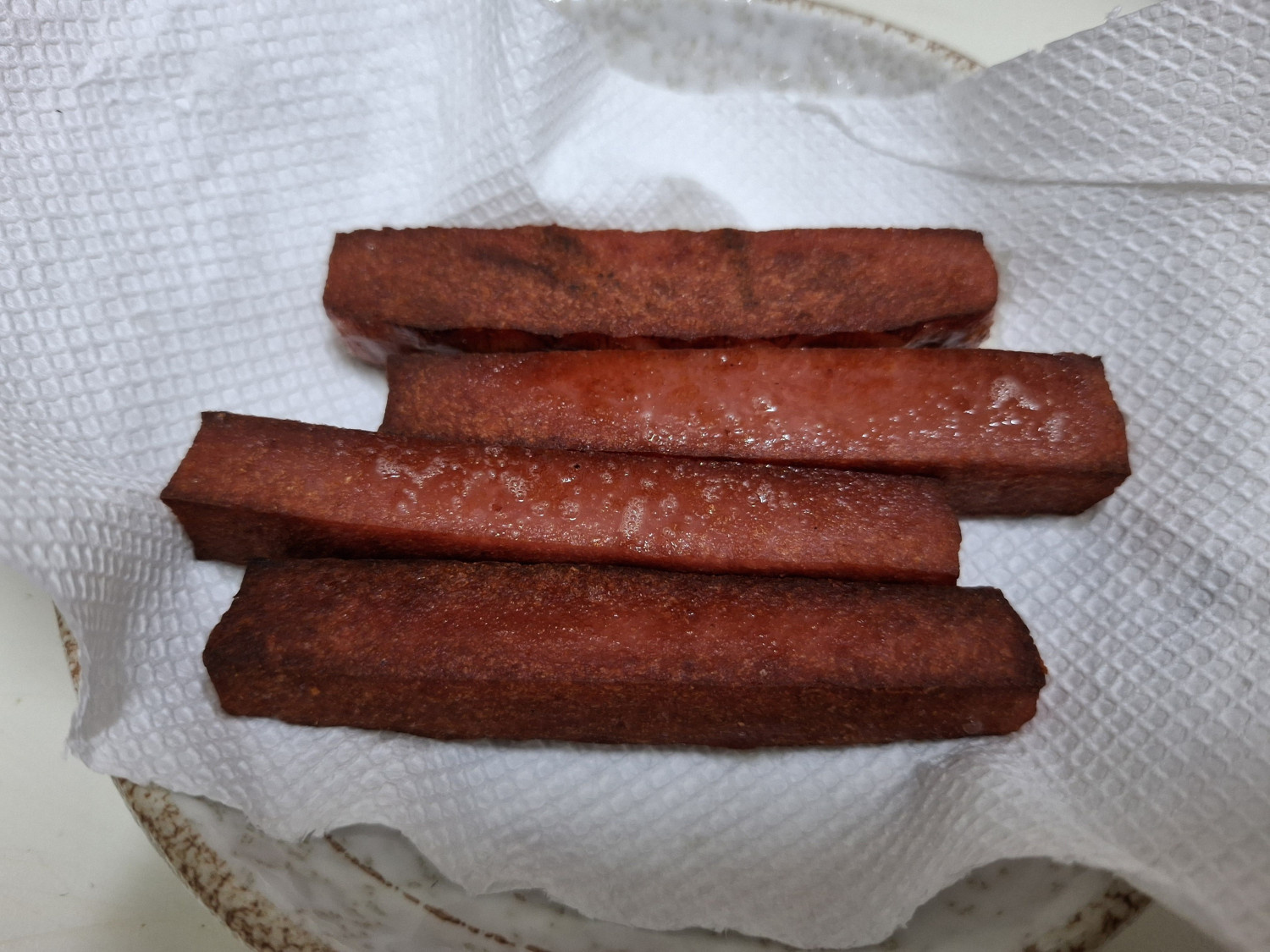 다구워진 햄은 키친타올 위에 올려서 기름기를 가볍게 제거할게요.
