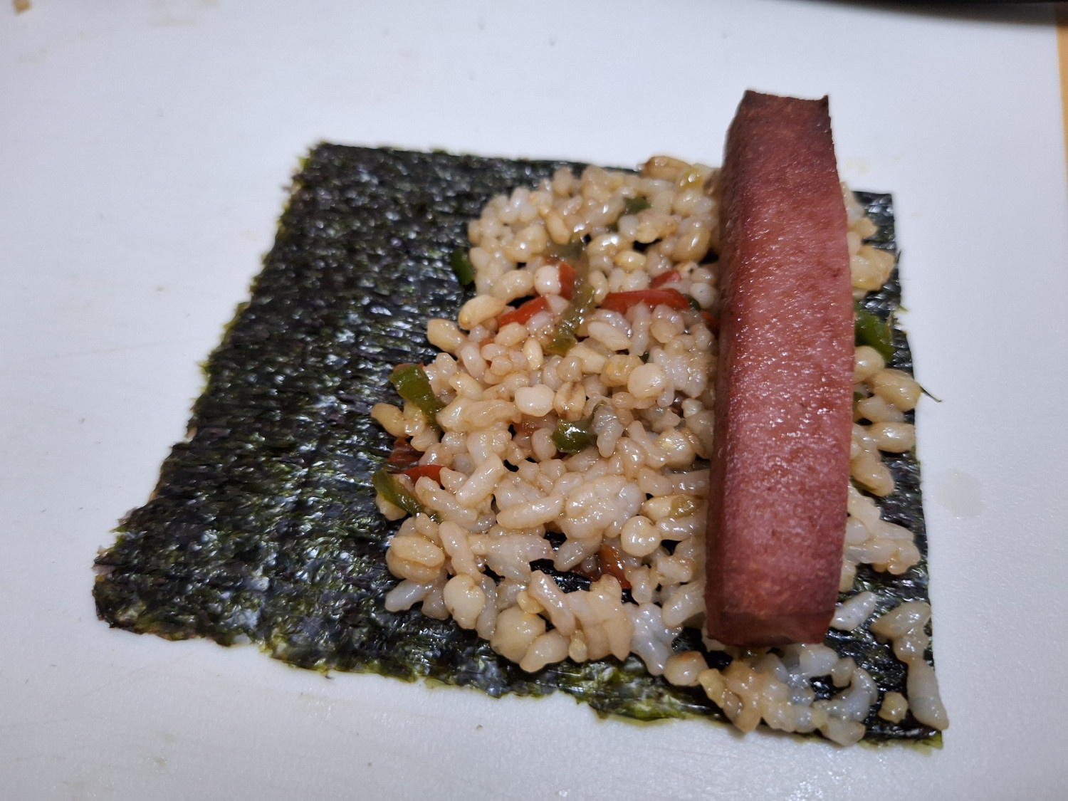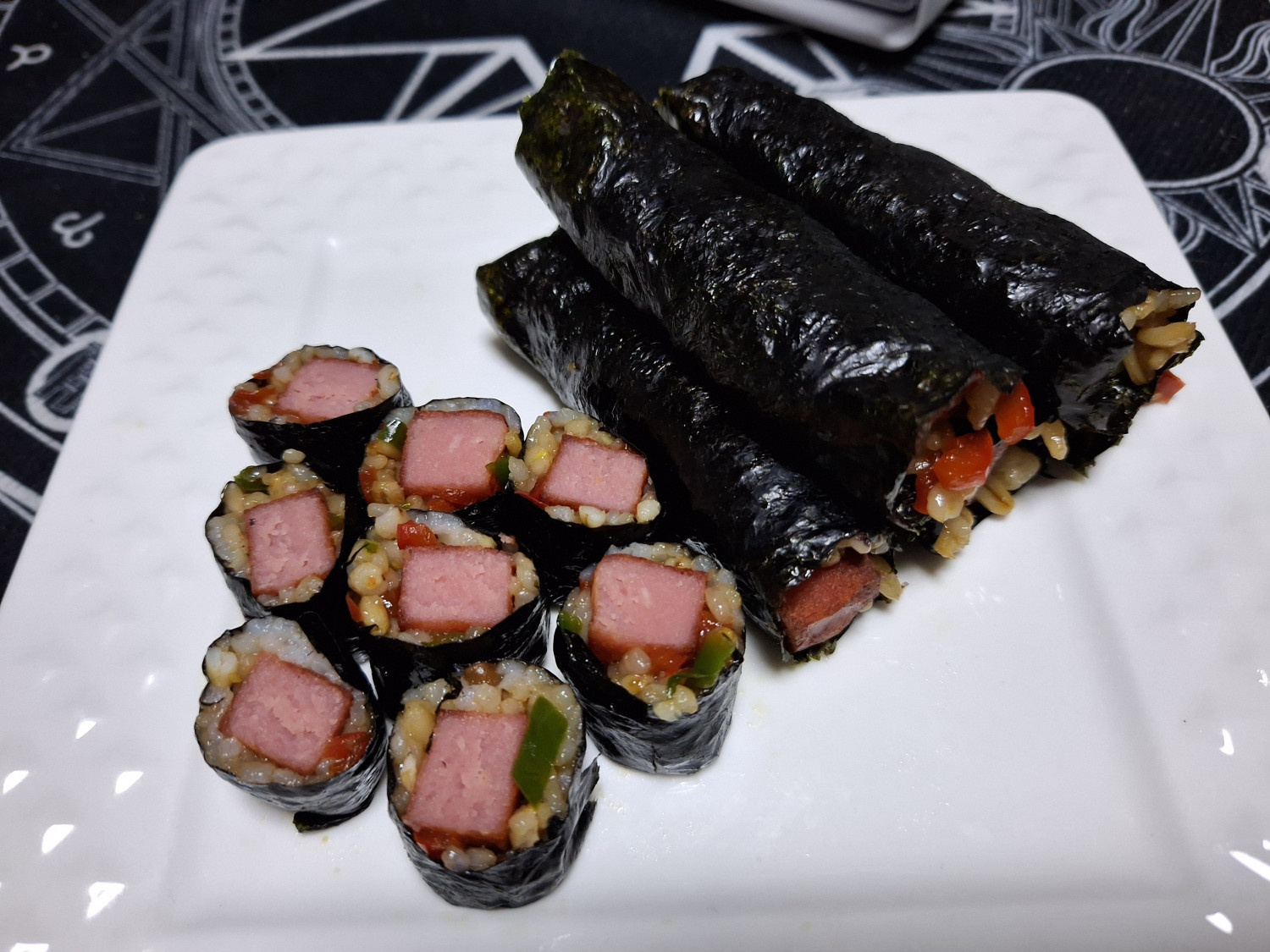 스모크햄 200 g , 밥 150 g , 김밥용 김 2 장 , 빨간파프리카 1/4 개 , 피망 1/4 개 , 진간장 1 숟갈 , 올리고당 1 숟갈 , 참기름 1 숟갈