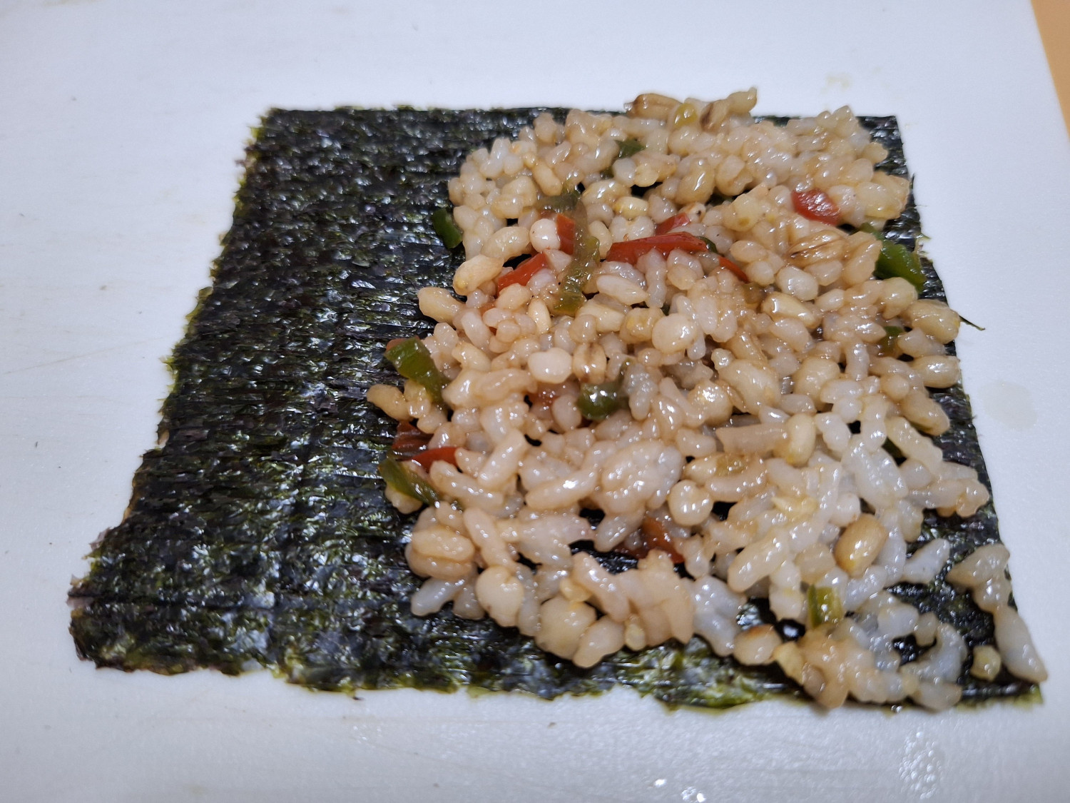 평평한 곳에 김 1/4장을 놓고 그위에 비벼둔 밥을 올려주시는데요.