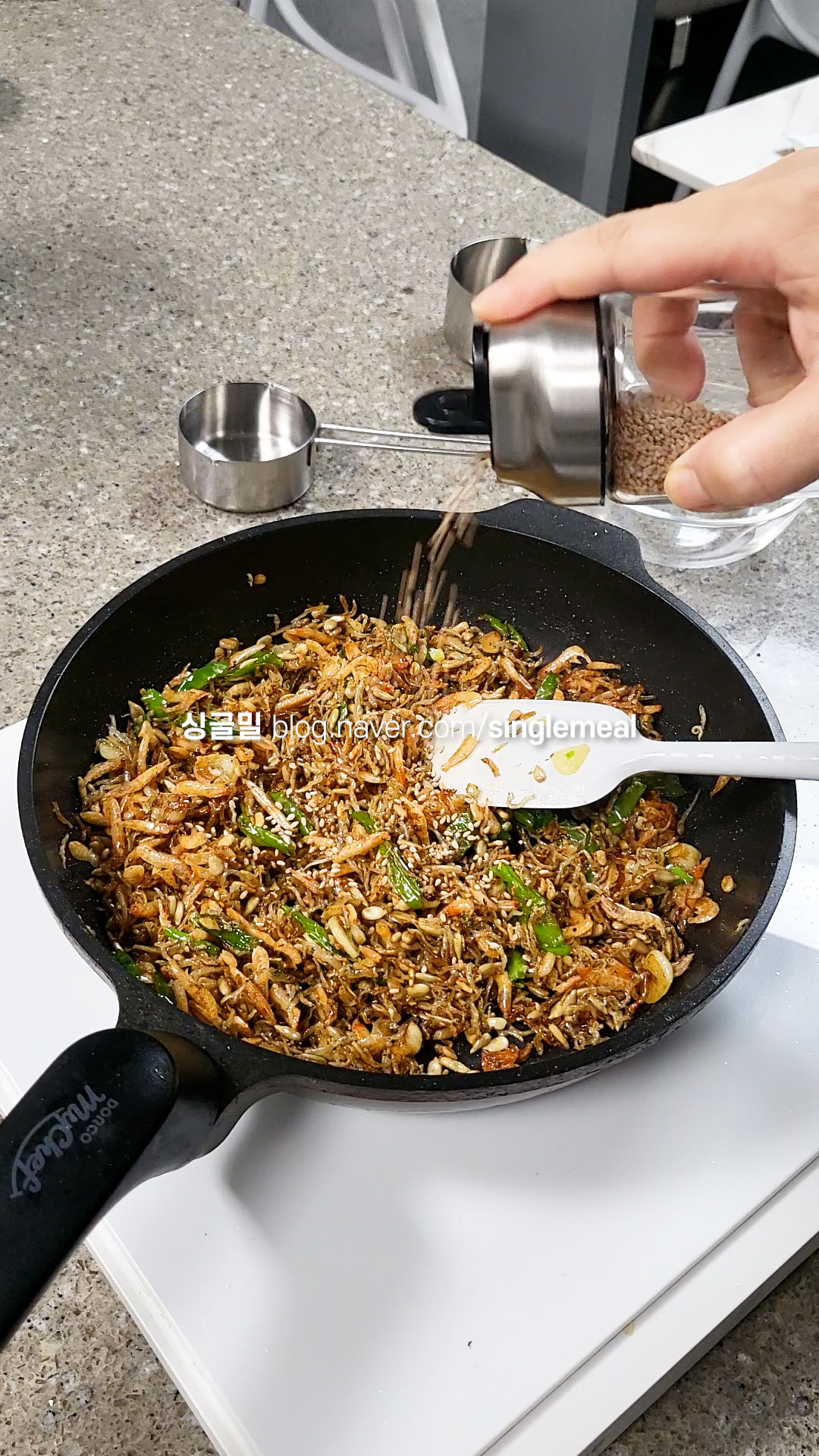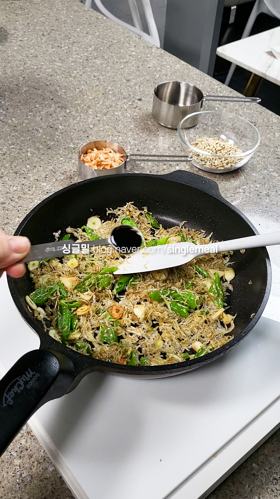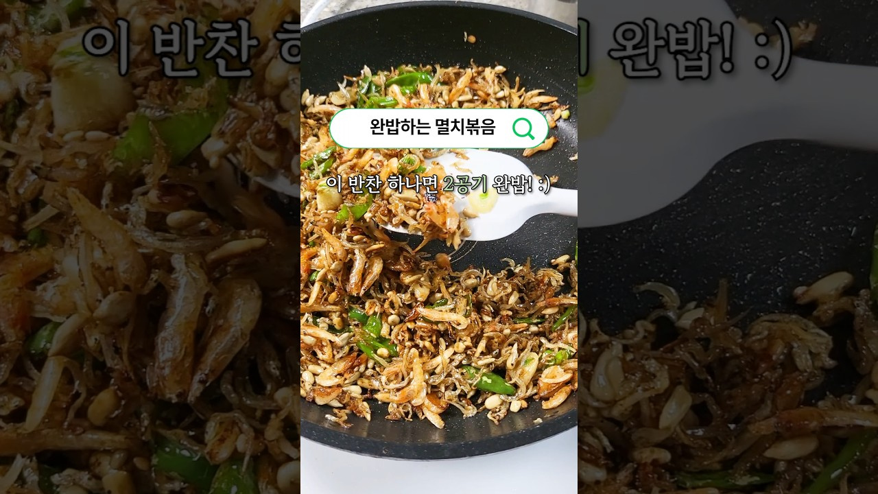 이제 주인공이 짜지 않은 잔멸치를 넣고.. 살짝 볶은 다음 간장으로 간을 합니다.